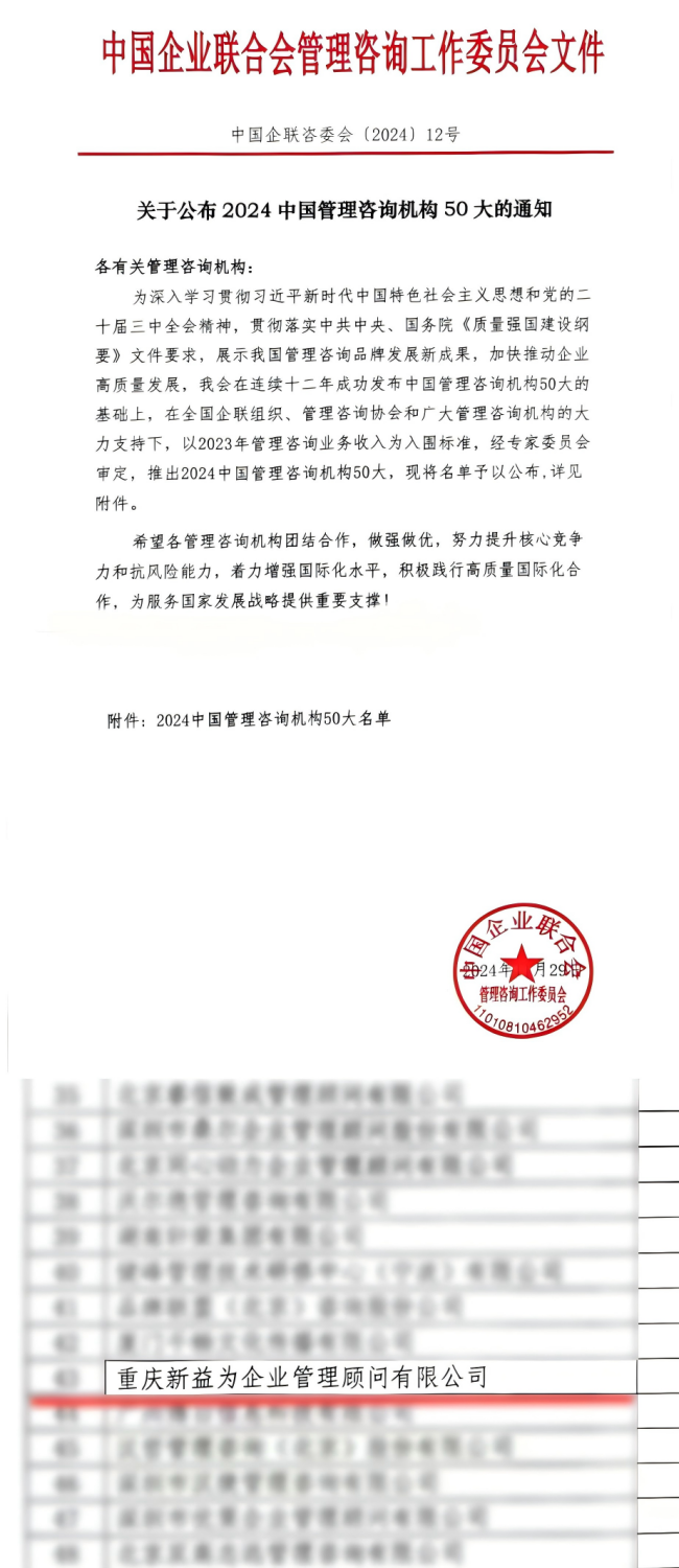 在當今時代浪潮洶涌澎湃之際,2024管理咨詢與培訓大會第八屆中小企業服務商大會盛大召開。在這一盛會上,備受矚目的“2024中國管理咨詢機構50大”評選結果重磅揭曉,重慶新益為企業管理顧問有限公司脫穎而出,成功躋身其中,成為西南地區企業管理咨詢領域的璀璨之星,閃耀于全國的舞臺之上。